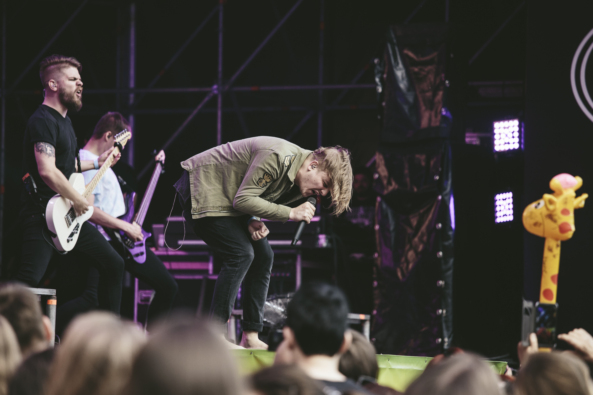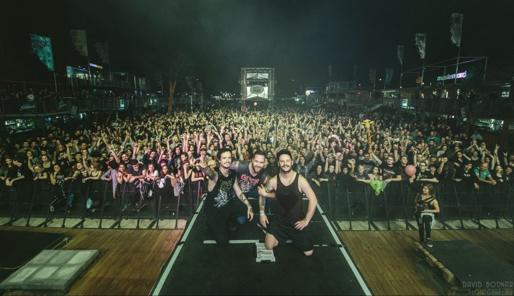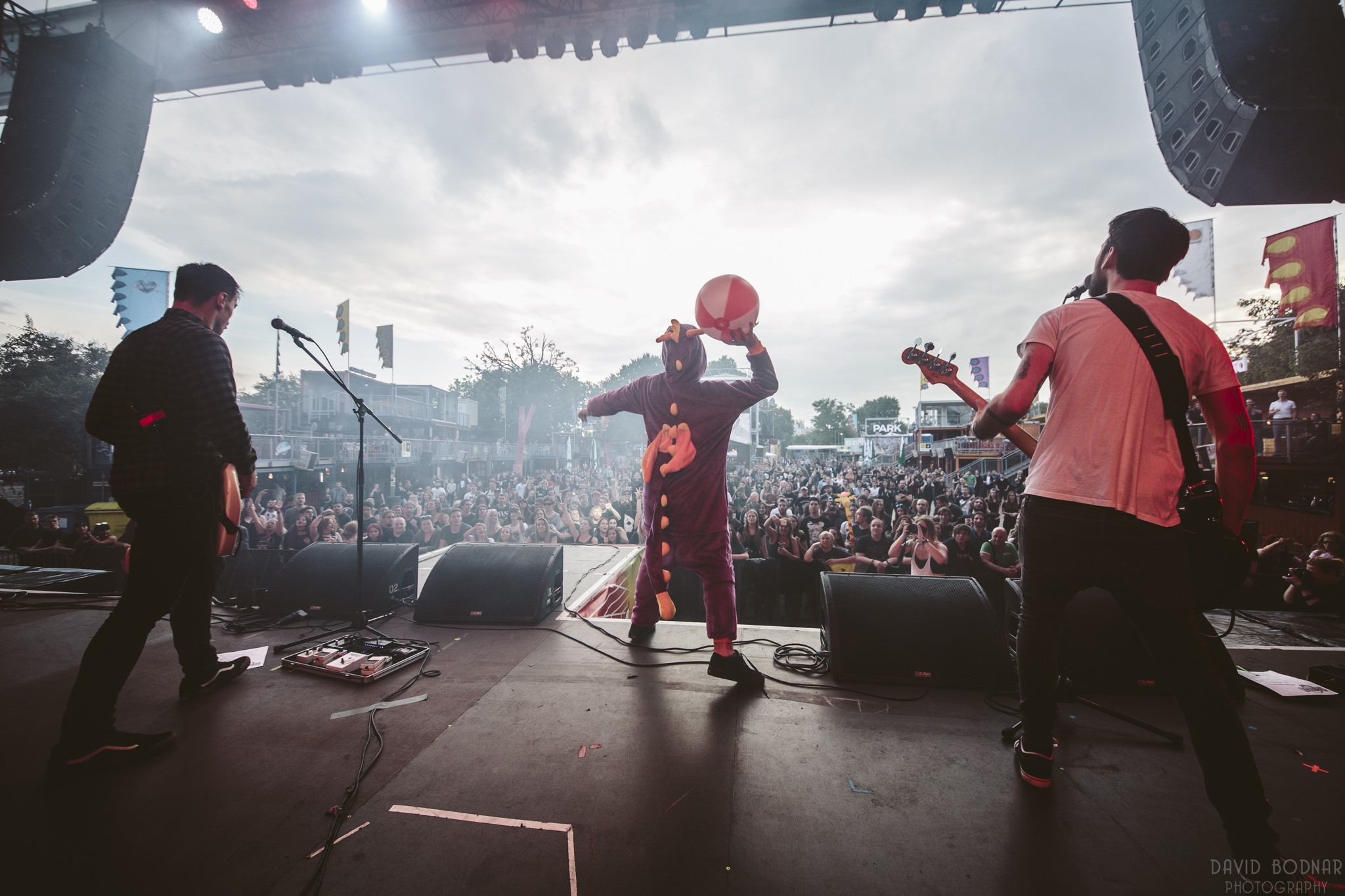 Aztán ahogy haladtunk előre a szettben, mégis egyre inkább az az érzésem támadt, hogy a srácoknak nem igazán sikerült kitölteniük a rendelkezésre álló kereteket. Persze mint mondtam, a színpadi kiállásuk kikezdhetetlen. Ugyanakkor egyrészt még mindig azt vallom, hogy a dalaik zeneileg alapvetően túl egyszerűek és egyformák ahhoz, hogy több mint egy órán keresztül is végig egyenletesen izgalmasak tudjanak maradni. (Viszont hallom bennük a fejlődést is, és könnyen lehet, hogy a következő lemez után már nem is merül majd fel ilyen probléma.) Másrészt pedig vizuális szempontból sem volt különösebben szórakoztató az előadás. A korai időpont miatt a fényeknek is minimál szerep jutott a látványvilágban, a kivetítőkön meg végig csak a banda logója vibrált bármilyen egyéb vizuális anyag, vagy mondjuk a színpad körül történő események mutatása helyett. Így aztán a hatalmas helyen az olyan bevett epizódok sem mindig tudtak érvényesülni, mint mondjuk a szokásos söritatós játék az Esti részegség előtt, amiből az első pár soron kívül jóformán senki semmit nem látott. Szerencsére a leguggoltatással meg a wall of death-ezéssel már nem volt ilyen gond, ahogy a műsor végére tartogatott Viszlát nyár kórus részével sem, ezeket abszolút kimaxolta a bő kétezer fős közönség.