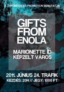 2010 legjobb poszt-rock bulija egészen biztos, hogy a Gifts From Enola Szabad az Ában tartott koncertje volt: nem elég, hogy a műfaj egyik legjobb bandája teljesen lehidalt a teltháztól, de még a Népszabadság is jókat írt a koncertről! Már akkor sokan kérték, hogy jöjjön újra a banda, a közönség szava márpedig parancs, így újra hazánkba látogatnak a poszt-rock atombombázói, ezúttal pedig az Olaszországból nemrég hazatért marionette ID mellett a Képzelt Város melegíti majd be a színpadot. Hogy mit kell tudni a virginiai srácokról? Azt, hogy a poszt-rock náluk nem feltétlenül az epikus, klimaxozós, ezerszer hallott háttérzenét jelenti, nem dísznek van ott a rock: a stílus főbb elemei mellé sok indie rock társul, néhány matekos elem itt-ott, és érkeznek díszítő jellegű énektémák is, meg persze a kellő ideig kitartott témák után kellő időben érkező váltások. A kulcsa az egésznek, hogy mindent sokkal jobb arányérzékkel csinálnak, mint a legtöbb műfajbéli zenekar (példának okáért ha már ég, meg robbanás, akkor az Explosions' lassan visszakérhetné a nekik adott leckéket), így pedig a sokszor hallott panelek nem zavaróak, hanem csak egyszerűen működnek. (JÁ)