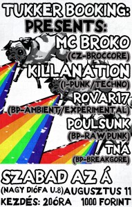 MC Broko a cseh (azaz költözését követően az osztrák) underground végtelenül kitartó és végtelenül meg nem értett élharcosa, akinek mindig van egy új ötlete, és nem habozik azt dalban elmondani. Legyen szó korábbi zenei próbálkozásairól a grindcore, a hardcore vagy épp a punk közegében, valahogy sosem találta a saját hangját, így nekifogott új projektjének, ahol elektronikus alapokat kísér olykor gitárral, olykor bársonyos sikolyaival. A produkció ilyen szempontból nagyon közel áll a Drumcorpshoz, ám az itt megidézett hangulatok annál sokkal pszichopatábbak: a szintetizátorból érkező dallamok épp annyira gyermetegek, amennyire szétzúzhatók pár frissen érkező breakkel és bassline-nal, hogy a szintén váratlanság erejével ható metal és hardcore-betétekről ne is beszéljünk. Hősünk mindemellett amennyire expresszionista, annyira a DIY bolondja is, gyakorlatilag ahol lehet, ott játszik, és nem feltétlenül törődik semmivel: csupán szeretne táncra perdíteni mindenkit, ami nyilván lehetetlen, de többszöri hazai próbálkozásai után végre Budapest közönségét is megpróbálja megsüketítve sasszéztatni. A Shitrecords egyik alapítója mellett a fővárosi Havizaj-sorozatok bástyája, a Rovar17 is tiszteletét teszi, hogy a vihari előtti csendet vihar előtti zúgással oldja fel, ahogy a Poulsunk és a TNA is tiszteletét teszi a koncerten, ám Broko turnépartneréről, az olasz Killanationről sem feledkezhetünk meg, akik a techno szeletelését punkosítják, filterezik: zenéjük épp annyira ipari a Mindless Self Indulgence nyomvonalán, amennyire paranoid, de hát ezen az estén épp az lenne a furcsa, ha valami a konvenciók szerint működne. (Bali Dávid)