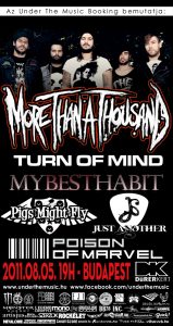 A portugáloknál elindult valami azzal, hogy a Hills Have Eyes és a More Than A Thousand neve bekerült a nemzetközi körforgásba, hiszen mindkét zenekar bizonyítja azt az íratlan szabályt, hogy kiváló dalokkal feledtetni lehet az egyediség hiányát. Márpedig ez a tényező mindkét zenekart jellemzi, így az ismét Budapestre tévedő More Than A Thousand kapcsán sem lehet tévedni, elvégre hőseink lényegében lehetetlen feladatot hajtottak végre a Make Friends and Enemies dalaival: slágeres metaldalokat írtak izzadtságszag nélkül. Persze ez így leírva nem feltétlenül izzasztja le az embert, de ha a dolgok mélyére ásunk, rá kell döbbennünk, hogy rég volt olyan nemzetközi minőségű dalcsokor, ami ennyire szórakoztató, ennyire hallgattatja magát, és mellette a zenekari tagok sem küszködnek rocksztári allűrökkel. Persze a lemezcím nomen est omen tartalma valahol definiálta is a bandát: van, aki tényleg ráérzett a slágeresség ízére, és esélye sincs menekülni, és van, aki értetlenül veti meg a produkciót sematizmusra hivatkozva, ám a banda érettsége vitathatatlan, és a koncertkiállásukkal sincs semmi probléma. Ezért is örömteli ez a hirtelen visszatérés a Dürer Kertben, erősítésként pedig hazai bandák garmadája fog érkezni, így az ingyenes letöltés oltárán áldozó Turn Of Mind, a My Best Habit, a Pigs Might Fly, a Just Another és a Poison Of Marvel melegíti be a színpad előterét. (Bali Dávid)