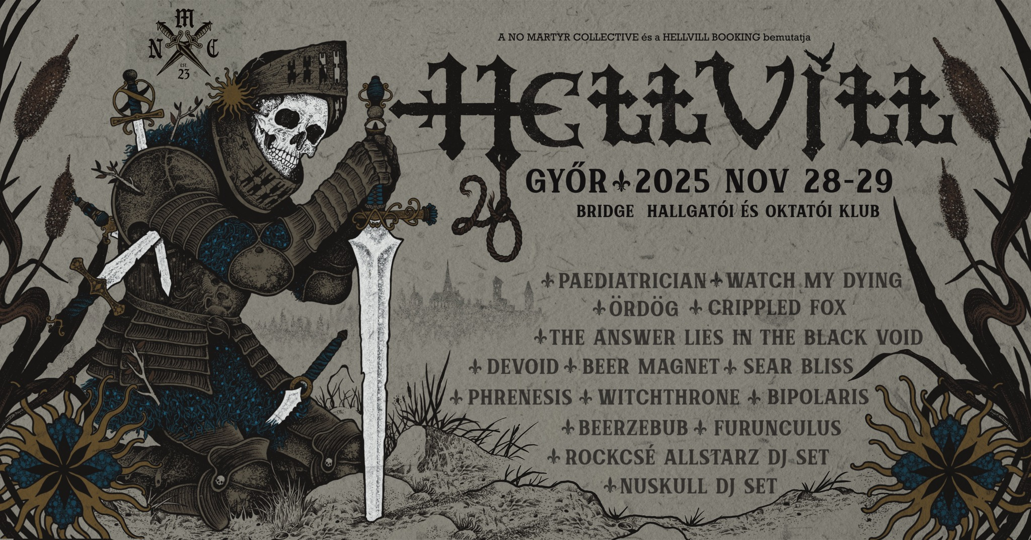 Az utóbbi néhány évben kicsit hektikusan alakult a Hell Vill fesztivál története: a hazai underground seregszemle többször is költözni kényszerült, ebből adódóan járt Székesfehérváron, Budapesten, de még az Eger melletti Felsőtárkányban is, idén pedig végre visszatér a szülőföldjére, Győr-Moson-Sopron vármegyébe, és gyakorlatilag összeolvad a No Martyr Collective szokásos helyi évzáró bulijával. Az idei jubileumi, 20. Hell Villnek a győri Bridge klub ad otthont november 28. és 29-én, és most végre a fellépők teljes névsora is kiderült. Eszerint a kétnapos bulin az alábbi bandák játszanak: