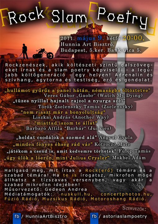 Szia Csabi, köszönöm az interjúlehetőséget, baráti jobbom a NuSkullt olvasó srácoknak és csókom a hölgyeknek! 2011. május 9-én hétfőn lesz este 8 órakor a Hunnia Art Bisztróban (Budapest V. ker. Bank utca 5.), a Rock Slam Poetry elnevezés pedig onnan jött, hogy a slammerek mellett a hazai rock színtéren elismerésre méltó dalszövegek írására képes muzsikusokat is meghívtam erre a rendezvényre. A zenészek közül örömmel üdvözlöm Veres Gábort a Watch My Dyingból, Török Zselenszky Tamást, Liszkai Andrást az Another Way zenekarból, illetve Barbaró Attilát a Junkiesból. A slammerek között pedig ott lesz Kotroczó Máté, Fülöp Tamás, illetve Mokbel Ádám, valamint jómagam is, persze.